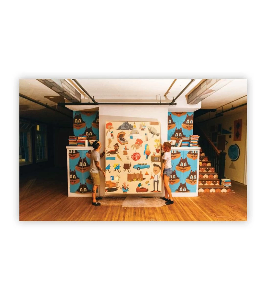 Dans le travail ou dans la vie, le duo d’artistes Dabs Myla ne manque pas une occasion de nous montrer ses compositions colorées et explosifs, faisant sa renommée. Fleuri, pop et onirique, le style de Dabs Myla a séduit la marque Modernica avec qui ils ont réalisé une collaboration des plus spectaculaires. C’est en 2015 que tout se passe quand le duo prend possession des près de 371 m2 du bâtiment de Modernica à Los Angeles, le couvrant de ses motifs et créations du sol au plafond : peintures, sculptures, installations, meubles, céramiques… Dabs Myla vit un moment déterminant dans la vie comme dans l’art.