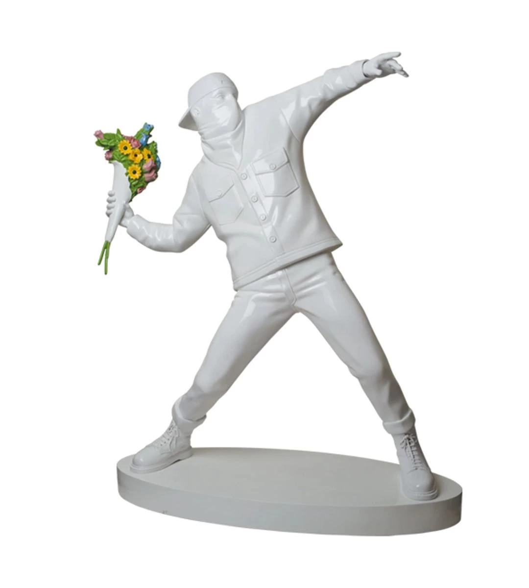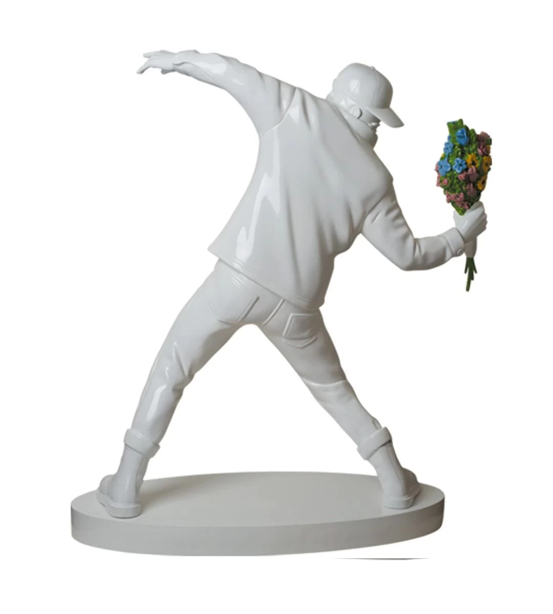Une de ses œuvres phare reste, encore aujourd’hui, le Flower Bomber, ce jeune émeutier qui plutôt que de lancer un objet contondant, s’apprête à lancer un joli bouquet de fleurs.